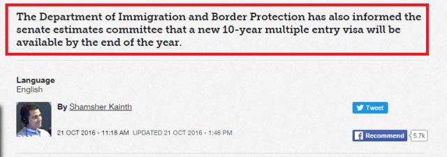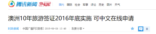 今年二月份,澳大利亚外长毕晓普在和中国外长王毅会见记者时表示,澳大利亚正在开展针对中国游客发放十年有效签证的试点工作,并敦促尽快审批发放中国游客签证,以吸引更多中国游客赴澳旅游。而近日,SBS又报道出来最新消息!联邦移民部已向澳洲参议院委员会发出通知,全新的十年多次往返签证将会在今年年底前生效!