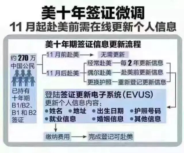 近日,美国国土安全部海关及边境保护局发布通知:从2016年11月1日起,凡持有中国护照及10年有效商务/旅游(B1/B2,B1,B2)签证的旅客,在入境美国前必须先到“电子签证更新系统”(Electronic Vis-aUpdate System,EVUS)登记个人信息,否则即使坐飞机抵达美国,也将被拒绝入境。