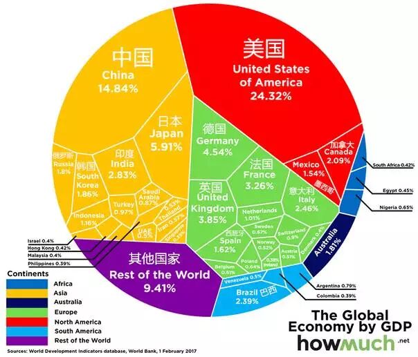 2月24日,来自世界银行的最新GDP数字于2月公布,下图我们可以清楚地看到各个国家在全球经济中所占的相对份额。