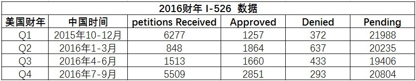 在整体收件数量接近的前提下,相比2015财年,去年的I-526申请拒绝量显著提高由1051个升至1731,高达近70%!